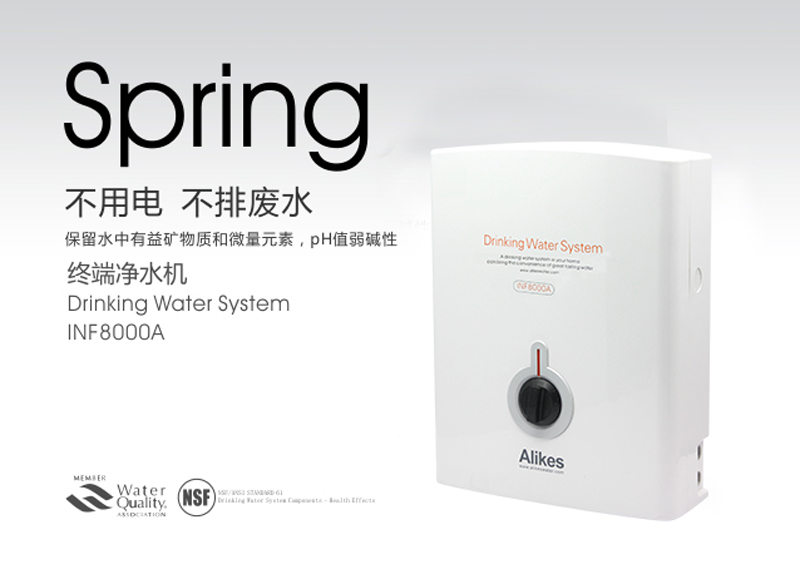 Alikes凈水機(jī)是對市政自來水或可以飲用的地下水進(jìn)行二次深度凈化處理的終端水處理設(shè)備,出水品質(zhì)符合衛(wèi)生部《生活飲用水水質(zhì)衛(wèi)生規(guī)范》(2001)的規(guī)定。凈水機(jī)利用市政管道自來水的壓力驅(qū)動水流,通過獨(dú)特的濾芯來達(dá)到生飲的標(biāo)準(zhǔn)。陶瓷芯可去除水中的泥沙、******、鐵銹、懸浮物,終身刷洗120次;KDF可去除有害重金屬;燒結(jié)活性炭吸附水中余氯、異色和異味。不需用電,不產(chǎn)生廢水,即用即飲,不需儲水罐避免二次污染。內(nèi)置流量計根據(jù)用水量自動斷水確保飲水健康。是凈水機(jī)中的高端產(chǎn)品。