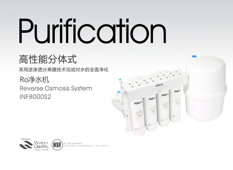 Alikes RO凈水機是對市政自來水或可以飲用的地下水進行二次深度凈化處理的終端水處理設備,出水品質符合衛(wèi)生部《生活飲用水水質衛(wèi)生規(guī)范》(2001)的規(guī)定。凈水機應用了******進的逆滲透分離膜的技術,依靠增壓泵對原水施加壓力,使原水透過逆滲透膜,把原水中細微雜質、過多的無機鹽、有機物、重金屬離子、******、病毒、農藥、三氯甲烷致癌物等有害物質截留,并通過連續(xù)排放的濃水出口(污水排放口)將這些水中有害異物排出。進而完成對水質的******凈化。